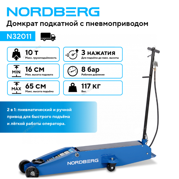 NORDBERG N32011 — это мощный и надёжный домкрат с пневматической системной, повышающий скорость и комфорт в работе с автотранспортом.