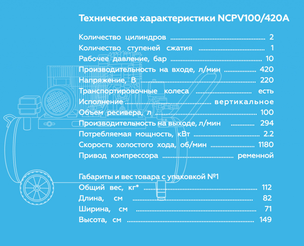 NORDBERG NCPV100/420A Компрессор вертикальный поршневой с ременной передачей, 220 В, ресивер 100 л, 420 л/мин