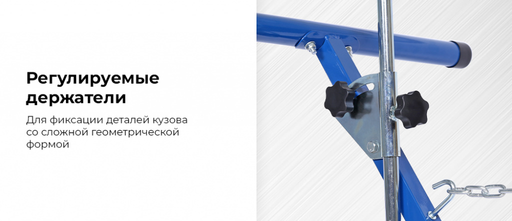 Дополнительные регулируемые держатели обеспечивают более удобную фиксацию кузовных деталей со сложной геометрической формой, например широких и длинных бамперов с закруглениями к капоту и крыльям, имеющими большую площадь поверхности.