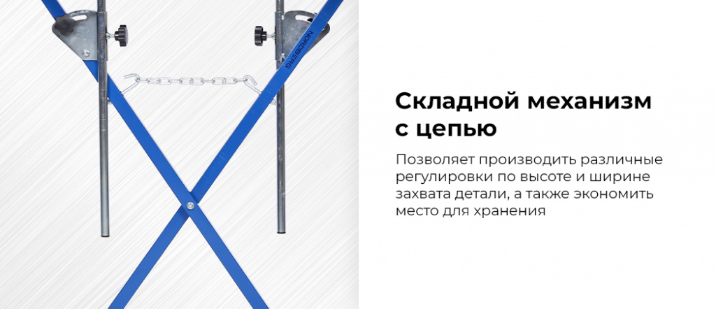 Складной механизм стенда позволяет производить различные регулировки по высоте и ширине захвата детали, а также экономить место для хранения