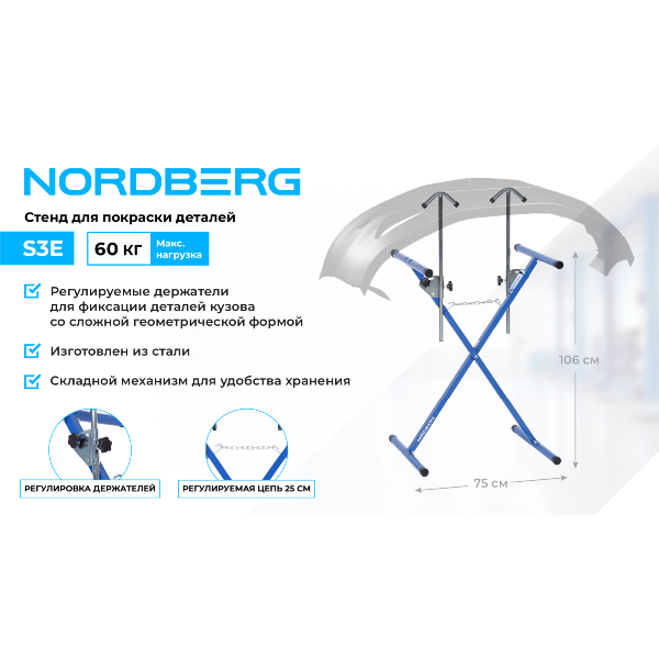 Стенд для покраски деталей NORDBERG S3E – вспомогательное оборудование, предназначенное для фиксации на нем демонтированных с автомобиля кузовных деталей с целью их подготовки, покраски и и др. работ, проводимых в специализированных автосервисах и СТО.